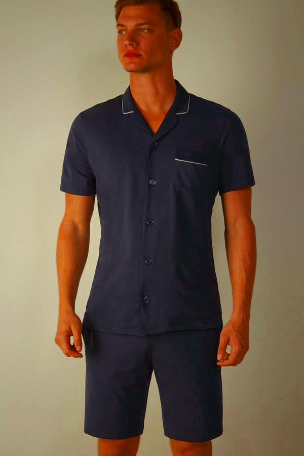 Intimissimi Supima cotton button-front cropped pajamas for men in blue. Soft fabric and stylish design for ultimate comfort.