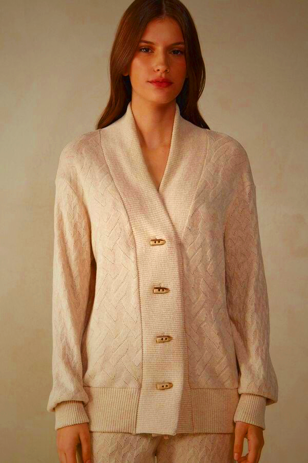 Stay cozy and stylish this winter with the Beige Intimissimi Winter Braid Long Sleeve Jacquard Cardigan. Designed for women, this cardigan features a luxurious jacquard pattern, long sleeves, and a comfortable fit in multiple sizes. Perfect for lounging or layering during colder months.