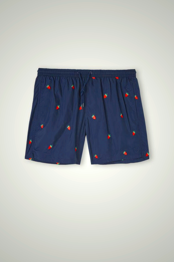 Stylish men’s swimwear featuring a blue embroidered strawberry design. Comfortable fit with vibrant detailing. Available in sizes XXS to XXL.