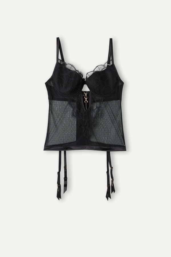 Elevate your lingerie collection with the Intimissimi Pure Charme Guipure Demi Bustier. This elegant black bustier features delicate guipure lace and a flattering demi cut for a sophisticated fit. Perfect for special occasions or everyday luxury, it offers comfort and style in every wear.